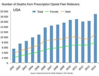 | Keywords: US timeline. Prescription opioid pain reliever deaths.svg en National Overdose Deaths ”Number of Deaths from Prescription Opioid Pain Relievers The figure above is a bar chart showing the total number of U S overdose deaths involving opioid pain relievers from 2001 to 2014 The chart is overlayed by a line graph showing the number of deaths by females and males From 2001 to 2014 there was a 3 4-fold increase in the total number of deaths 2016-12-26 - date SVG file created and uploaded based on File US timeline Prescription opioid pain reliever deaths jpg which is based on https //d14rmgtrwzf5a cloudfront net/sites/default/files/cdc-us-overdose-deaths-2014_jr-2 jpg Chart from http //www drugabuse gov/related-topics/trends-statistics/overdose-death-rates Overdose Death Rates By National Institute on Drug Abuse NIDA I created this SVG file based on the following and changed the yellow line to green because the RGB yellow did not provide much contrast against a white background Original by National Institute on Drug Abuse And User Timeshifter who cropped the original chart and added USA to it put the adapted chart under the same public domain license See Commons Convert tables and charts to wiki code or image files and the section about adding text to chart images other versions PD-USGov Drug-related death statistics |