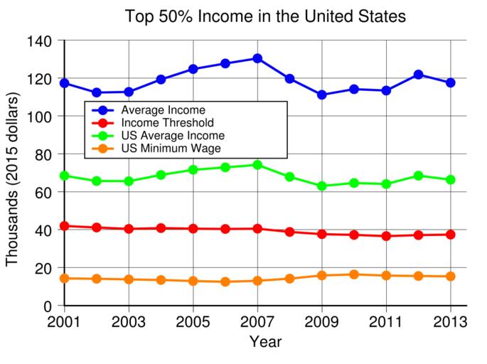 | Keywords: US Top 50 Percent Income.svg translate yes en US Top 50 average income and income threshold from 2001 to 2013 in constant 2015 dollars with US average income and US minimum wage 40 hour work week Data is from https //www irs gov/pub/irs-soi/13in01etr xls US IRS 2015-06-06 own Delphi234 other versions For data see File US Top 0 001 Percent Income svg Generated with Wikimedia SVG Chart SVG Chart/box current annually cc-zero Income distribution in the United States | ||||