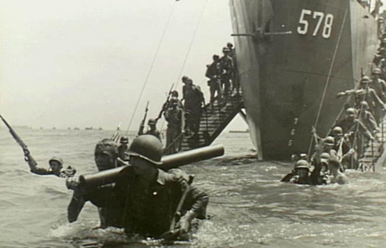 Keywords: US troops landing into deep water Morotai 017591.jpg AWM image 017591 US Army soldiers disembark into deep water during the landing at Morotai 017591 1944-09-15 Jack Bland The photo has a copyright status of 'Copyright expired - public domain' on the Australian War Memorial collections database PD-Australia Battle of Morotai Black and white photographs |