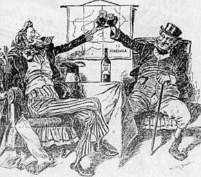 | Keywords: US and UK following Britain's agreement to go to arbitration in 1896.jpg en An 1896 cartoon from an American newspaper following Britain's agreement to go to arbitration Uncle Sam and John Bull toast in front of a map of Venezuela es Caricatura de 1896 de un diario estadounidense siguiendo el acuerdo de EE UU y Gran Bretaña de ir a arbitraje para definir la frontera entre Venezuela y Guayana Británica http //www guyana org/features/shape_guyana html American Newspaper 1896 PD-old Guiana Arbitration Tribunal Paris 1899 1896 cartoons 1890s political cartoons of the United States Political cartoons of the United Kingdom Uncle Sam John Bull Toasting in art |