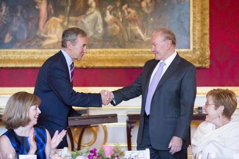 | Keywords: US, UK Joint Chiefs of Staff talk collaboration 140610-D-KC128-734.jpg en Chairman of the Joint Chiefs of Staff U S Army Gen Martin E Dempsey standing right shakes hands with Chief of the Defense Staff British army Gen Sir Nicholas Houghton after giving a gift during a dinner in honor of the U S Joint Chiefs of Staff concluding a defense chiefs strategic dialogue with the U S Joint Chiefs of Staff and their British counterparts June 10 2014 in London DoD photo by Mass Communication Specialist 1st Class Daniel Hinton U S Navy/Released 2014-06-10 Petty Officer 1st Class Daniel Hinton https //www dvidshub net/image/1399237 140610-D-KC128-734 2014-06-14 18 01 LONDON GTL GB PD-USGov Nicholas Houghton Martin E Dempsey in 2014 Images from DoD uploaded by Fæ |