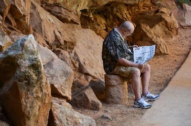 Keywords: usa america trail zion national park utah pensioners senior man person older vital vitality summer leisure break nature rest read card elderly human rock bank