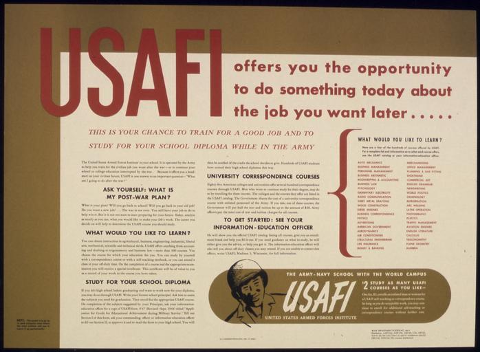 Keywords: USAFI OFFERS YOU THE OPPORTUNITY TO DO SOMETHING TODAY ABOUT THE JOB YOU WANT LATER... - NARA - 515893.jpg Scope and content General notes 515893 Local identifier 44-PA-2184 Office for Emergency Management Office of War Information Domestic Operations Branch Bureau of Special Services 03/09/1943 - 09/15/1945 Still Picture Records Section Special Media Archives Services Division NWCS-S National Archives at College Park 8601 Adelphi Road College Park MD 20740-6001 1941 - 1945 Record group Record Group 44 Records of the Office of Government Reports 1932 - 1947 Record group ARC 373 World War II Posters compiled 1942 - 1945 Series ARC 513498 File unit File unit ARC Variant control numbers NAIL Control Number NWDNS-44-PA-2184 Other versions <gallery> File USAFI_OFFERS_YOU_THE_OPPORTUNITY_TO_DO_SOMETHING_TODAY_ABOUT_THE_JOB_YOU_WANT_LATER _-_NARA_-_515893 tif tif File USAFI_OFFERS_YOU_THE_OPPORTUNITY_TO_DO_SOMETHING_TODAY_ABOUT_THE_JOB_YOU_WANT_LATER _-_NARA_-_515893 jpg jpg </gallery> NARA-cooperation PD-USGov World War II posters from the United States |