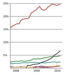 | Keywords: Usage share of alternative web browsers.svg Usage share of alternative web browsers Source StatCounter svg Newer data middle of 2008 October 2011 Legend red Firefox black Chrome green Safari teal Opera blue Netscape purple Opera Mini Orange Other validSVG Usage share of alternative web browsers all browsers except MS IE Schema che mostra l'uso dei browser alternativi tutti i browser tranne MS IE Marktanteile alternativer Webbrowser alle Browser außer MS IE Alternatif web tarayıcılarının kullanım oranları MS IE hariç أغلب المستخدمين يفضلون برنامج موزيلا فاير فوكس الأكثر شعبية Procentowy udział alternatywnych przeglądarek na świecie Reparto del uso de navegadores web alternativos todos los navegadores excepto MS IE Использование альте нативных б аузе ов всех к оме IE 使用 主流網頁 覽器的佔 率(除了 MS IE 以外的 覽器) 使用 主流网页浏览器的占 率(除了 MS IE 以外的 浏览器) self-made http //marketshare hitslink com/browser-market-share aspx qprid 1 qptimeframe M qpsp 99 qpnp 18 November 2007 - April 2009 http //marketshare hitslink com/browser-market-share aspx qprid 1 qptimeframe M qpsp 124 qpnp 18 May 2009 - Present 2010-09-01 ARC Gritt thumb left 350px Historical browser market share October 2005 to May 2009 Line charts of web browser statistics |