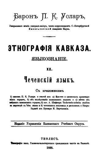 | Keywords: Uslar-Chechen grammar cover.jpg en Cover of Peter Uslar's Chechen Grammar 1892 ru Обложка книги П К Усла а Чеченский язык 1892 Усла П К Этног афия Кавказа Языкознание II Чеченский язык Тифлис 1888 Author 1888 PD-old Petr Karlovich Uslar Title pages from Russia Books from Russia 1888 Linguistics books Printed books Chechen language Books published in Tbilisi |