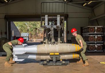 | Keywords: USMC airmen load bombs onto a bomb skid at RAAF Base Tindal in August 2016.jpg en Sgt Joel Farmer left aviation ordnance technician and quality assurance officer and Cpl Michael Konicki right aviation ordnance technician team member assigned to Marine Aviation Logistics Squadron 12 load bombs onto a bomb skid during Southern Frontier at Royal Australian Air Force Base Tindal Australia Aug 22 2016 The bomb skid will then be transported to the line where the munitions are loaded on to aircraft Southern Frontier afforded Iwakuni Marines the opportunity to train with high explosive weapon body groups typically not used in Japan while expanding technical and tactical proficiency in their craft Munitions built during this training are in support of Marine Fighter Attack Squadron VMFA 122 who also gain experience and qualifications in low altitude air-ground high explosive ordnance delivery at the unit level U S Marine Corps photo by Cpl Nicole Zurbrugg 2016-08-22 08 18 58 https //www flickr com/photos/us-pacific-command/28919355510/in/dateposted/ U S Marine Corps photo by Cpl Nicole Zurbrugg other versions PD-USGov RAAF Base Tindal People of the United States Marine Corps Air-dropped bombs of the United States Concrete bombs |