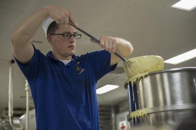 | Keywords: USS America activity 140815-N-MD297-087.jpg en Air-Traffic Controller 3rd Class Mark Valencourt a food service attendant temporarily assigned to the bake shop aboard future amphibious assault ship USS America LHA 6 scoops cake batter out of a mixing pot in the ship ™s bakery America is currently traveling through the U S Southern Command and U S 4th Fleet area of responsibility on her maiden transit America visits the Americas America is the first ship of its class replacing the Tarawa-class of amphibious assault ships As the next generation big-deck amphibious assault ship America is optimized for aviation capable of supporting current and future aircraft such as the MV-22 Osprey and F-35B Joint Strike Fighter The ship is scheduled to be ceremoniously commissioned Oct 11 in San Francisco U S Navy photo by Mass Communication Specialist 3rd Class Huey D Younger Jr /Released 2014-08-15 Petty Officer 3rd Class Huey Younger https //www dvidshub net/image/1506492 140815-N-MD297-087 2014-08-15 23 37 USS AMERICA AT SEA PD-USGov-Military-Navy MV-22B Osprey USS America LHA-6 Images from DoD uploaded by Fæ |