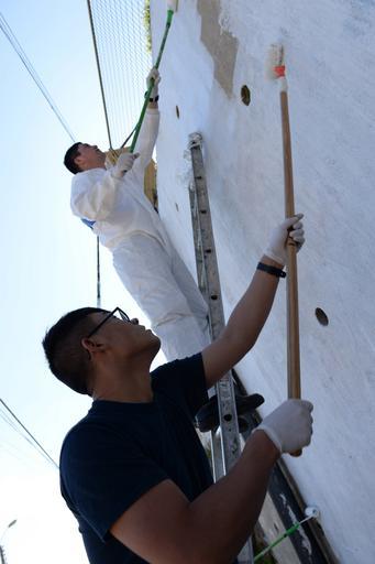 | Keywords: USS America operations 140826-N-MZ309-018.jpg en Seaman Shilong Zhou assigned to future amphibious assault ship USS America LHA 6 and a Chilean sailor paint an exterior wall at Arturo Prat Children ™s Home in Valparaiso Chile during a community service project America is currently traveling through the U S Southern Command and U S 4th Fleet area of responsibility on her maiden transit America visits the Americas America is the first ship of its class replacing the Tarawa-class of amphibious assault ships As the next generation big-deck amphibious assault ship America is optimized for aviation capable of supporting current and future aircraft such as the MV-22 Osprey and F-35B Joint Strike Fighter The ship is scheduled to be ceremoniously commissioned Oct 11 in San Francisco U S Navy photo by Mass Communication Specialist 2nd Class Ryan Riley/Released 2014-08-26 Ryan Riley https //www dvidshub net/image/1527866 140826-N-MZ309-018 2014-08-28 22 49 USS AMERICA AT SEA PD-USGov-Military-Navy MV-22B Osprey Aboard USS America LHA-6 Images from DoD uploaded by Fæ |