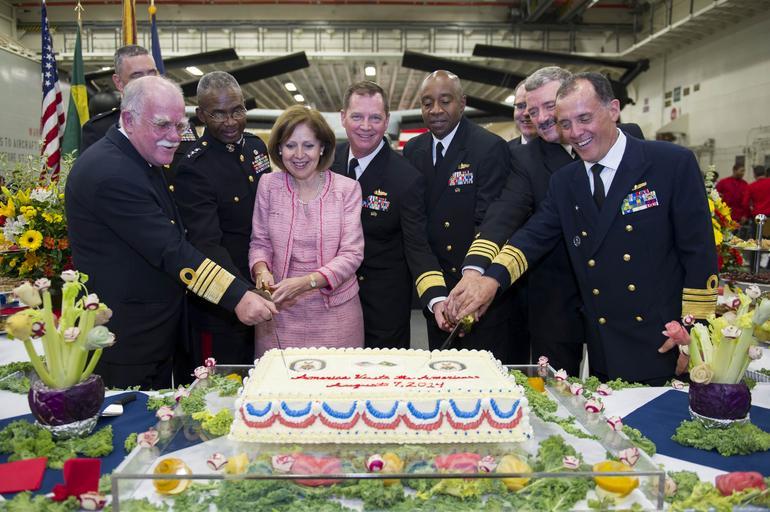 Keywords: USS America reception 140807-N-EV723-201.jpg en U S Ambassador to Brazil Liliana Ayalde center and the official party consisting of senior Brazilian and U S military leadership cut a ceremonial cake during a reception in the hangar bay of the future amphibious assault ship USS America LHA 6 America is currently traveling through the U S Southern Command and U S 4th Fleet area of responsibility on her maiden transit America visits the Americas America is the first ship of its class replacing the Tarawa-class of amphibious assault ships As the next generation big-deck amphibious assault ship America is optimized for aviation capable of supporting current and future aircraft such as the MV-22 Osprey and F-35B Joint Strike Fighter The ship is scheduled to be ceremoniously commissioned Oct 11 in San Francisco U S Navy photo by Mass Communication Specialist 1st Class Jason M Graham/Released 2014-08-07 Petty Officer 1st Class Jason Graham https //www dvidshub net/image/1497623 140807-N-EV723-201 2014-08-12 01 56 RIO DE JANEIRO BR PD-USGov-Military-Navy MV-22B Osprey Aboard USS America LHA-6 Images from DoD uploaded by Fæ |