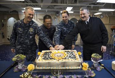 | Keywords: USS America's celebration of the Navy’s 239th birthday 141013-N-LD343-002.jpg en Capt Michael W Baze left executive officer of amphibious assault ship USS America LHA 6 and Capt Robert A Hall Jr right America ™s commanding officer cut the Navy birthday cake with the oldest crew member Chief Warrant Officer 4 Edwin Carpio and the youngest crew member Seaman Harley Dewitt in celebration of the Navy ™s 239th birthday America was recently commissioned during San Francisco Fleet Week 2014 and is the first ship of its class and the fourth to bear the name She replaces the Tarawa-class of amphibious assault ship as the next generation big-deck amphibious assault ship and is optimized for aviation and capable of supporting current and future aircraft such as the MV-22 Osprey and F-35B Joint Strike Fighter U S Navy photo by Mass Communication Specialist 1st Class Demetrius Kennon/Released 2014-10-13 Petty Officer 1st Class Demetrius Kennon https //www dvidshub net/image/1613002 141013-N-LD343-002 2014-10-14 03 21 SAN FRANCISCO CA US PD-USGov-Military-Navy MV-22B Osprey USS America LHA-6 Images from DoD uploaded by Fæ |