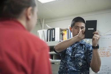 | Keywords: USS Bataan 131109-N-MW280-040.jpg en Hospital Corpsman Fernando Llamas from Alburquerque N M administers an explosive ordnance-handling physical to Gunner's Mate Seaman Rachel Campbell from Selma Ala aboard the multipurpose amphibious assault ship USS Bataan LHD 5 Sailors from the Bataan Amphibious Ready Group ARG and Marines assigned to the 22nd Marine Expeditionary Unit MEU are participating in ARGMEU exercises U S Navy photo by Mass Communication Specialist Seaman Chase Hawley/Released 2013-11-09 Petty Officer 2nd Class Chase Hawley https //www dvidshub net/image/1050316 131109-N-MW280-040 2013-11-11 15 34 ATLANTIC OCEAN AT SEA PD-USGov-Military-Navy USS Bataan LHD-5 22nd Marine Expeditionary Unit Images from DoD uploaded by Fæ |