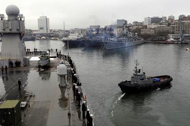 | Keywords: USS Blue Ridge in Russia DVIDS277854.jpg en Sailors and Marines man the rails aboard the U S 7th Fleet command ship USS Blue Ridge as the flagship pulls into Vladivostok Russia Blue Ridge Sailors will be engaged in a number of community outreach events in Vladivostok and will march with members of the Russian military during a parade to commemorate the 65th anniversary of Victory Day a national holiday in Russia 2010-05-07 Petty Officer 3rd Class Daniel Viramontes https //www dvidshub net/image/277854 100507-N-+++++-189 2010-05-10 20 55 VLADIVOSTOK RU PD-USGov-Military-Navy USS Blue Ridge LCC-19 Images from DoD uploaded by Fæ |