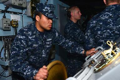 | Keywords: USS Blue Ridge operations 140328-N-KL617-021.jpg en Boatswain's Mate 3rd Class Saurya Shah mans the helm as U S 7th Fleet flag ship USS Blue Ridge LCC 19 returns to Yokosuka after a 30-day patrol While on patrol Blue Ridge visited Busan Republic of South Korea Hong Kong and Manila Philippines with embarked 7th Fleet staff Helicopter Sea Combat Squadron 12 and Marines from Fleet Anti-terrorism Security Team Pacific U S Navy photo by Mass Communication Specialist 3rd Class Kelby Sanders Unit Defense Imagery Management Operations Center DVIDS Tags sea; japan; blue ridge; anchor; DIMOC; DVIDS Bulk Import 2014-03-28 Petty Officer 3rd Class Kelby Sanders https //www dvidshub net/image/1580003/uss-blue-ridge-operations 140328-N-KL617-021 2014-10-04 01 20 YOKOSUKA JP PD-USGov-Military-Navy Fleet Anti-Terrorism Security Team Pacific USS Blue Ridge LCC-19 Images from DoD uploaded by Fæ |