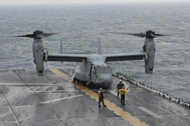 | Keywords: USS Bonhomme Richard 140419-N-LM312-019.jpg en An MV-22 Osprey tiltrotor aircraft assigned to Marine Medium Tiltrotor Squadron VMM 265 Reinforced prepares to take off from the flight deck of the forward-deployed amphibious assault ship USS Bonhomme Richard LHD 6 to conduct search and rescue operations in support of the sunken ferry Sewol Sailors and Marines aboard Bonhomme Richard are assisting in search and rescue operations as requested by the Republic of Korea navy near the scene of the sunken ferry Sewol in the vicinity of the island Jindo U S Navy photo by Mass Communication Specialist 2nd Class Adam D Wainwright/Released 2014-04-17 Petty Officer 2nd Class Adam Wainwright https //www dvidshub net/image/1260337 140419-N-LM312-019 2014-04-19 10 32 USS BONHOMME RICHARD AT SEA PD-USGov-Military-Navy MV-22B Osprey USS Bonhomme Richard LHD-6 Images from DoD uploaded by Fæ |