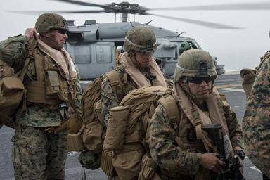 | Keywords: USS Bonhomme Richard flight deck operations 150331-N-RU971-024.jpg en 150331-N-RU971-024 WATERS TO THE EAST OF THE KOREAN PENINSULA Marines assigned to the 31st Marine Expeditionary Unit cross the flight deck of the forward-deployed amphibious assault ship USS Bonhomme Richard after returning from the Korean Marine Exchange Program U S Sailors and Marines from the Bonhomme Richard Amphibious Ready Group and the 31st MEU are participating in the KMEP in the Republic of Korea with the ROK marine corps and navy The Bonhomme Richard ARG is comprised of the amphibious assault ship USS Bonhomme Richard the amphibious transport dock ship USS Green Bay the Whidbey-island class amphibious dock landing ship USS Ashland and the embarked 31st MEU 2015-03-31 March 31 2015 https //www dvidshub net/image/1847960 150331-N-RU971-024 2015-03-31 07 58 USS BONHOMME RICHARD WATERS TO THE EAST OF THE KOREAN PENINSULA AT SEA PD-USGov-Military-Navy 31st Marine Expeditionary Unit USS Bonhomme Richard LHD-6 USS Green Bay LPD-20 Images from DoD uploaded by FĂŚ |