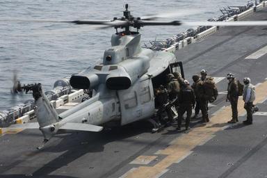 | Keywords: USS Bonhomme Richard operations 150329-N-LM312-011.jpg en 150329-N-LM312-011 WATERS TO THE EAST OF THE KOREAN PENINSULA March 29 2015 - Marines assigned to the embarked 31st Marine Expeditionary Unit MEU board an UH-1Y Huey helicopter assigned to Marine Medium Tiltrotor Squadron VMM 262 on the flight deck of the forward-deployed amphibious assault ship USS Bonhomme Richard LHD 6 U S Sailors and Marines from the Bonhomme Richard Amphibious Ready Group ARG are participating in the Korean Marine Exchange Program KMEP in the Republic of Korea ROK with ROK Marine Corp and Navy The Bonhomme Richard ARG is comprised of the amphibious assault ship USS Bonhomme Richard LHD 6 the amphibious transport dock ship USS Green Bay LPD 20 the Whidbey-island class amphibious dock landing ship USS Ashland LSD 42 and the embarked 31st MEU U S Navy photo by Mass Communication Specialist 2nd Class Adam D Wainwright/Released 2015-03-29 Petty Officer 2nd Class Adam Wainwright https //www dvidshub net/image/1843565 150329-N-LM312-011 2015-03-29 07 07 USS BONHOMME RICHARD WATERS EAST OF KOREA AT SEA PD-USGov-Military-Navy 31st Marine Expeditionary Unit USS Bonhomme Richard LHD-6 Images from DoD uploaded by Fæ |