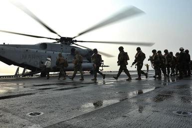 | Keywords: USS Bonhomme Richard operations 130213-N-SO729-025.jpg en Marines board a CH-53E Super Stallion helicopter assigned to Marine Medium Helicopter Squadron HMM 262 aboard the amphibious assault ship USS Bonhomme Richard LHD 6 The Bonhomme Richard Amphibious Ready Group is deployed in the U S 7th Fleet area of responsibility and is taking part in Cobra Gold a Thai-U S co-sponsored multinational joint exercise designed to advance regional security by exercising a robust multinational force from nations sharing common goals and security commitments in the Asia-Pacific region U S Navy photo by Mass Communication Specialist 2nd Class Adam M Bennett/Released 2013-02-13 Petty Officer 3rd Class adam bennett https //www dvidshub net/image/867264 130213-N-SO729-025 2013-02-15 06 43 AT SEA PD-USGov-Military-Navy Sikorsky CH-53E Super Stallion USS Bonhomme Richard LHD-6 Images from DoD uploaded by Fæ |
