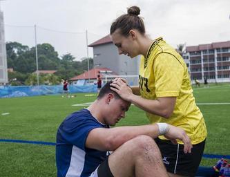 | Keywords: USS Carl Vinson Sailors play rugby with Singapore team 141003-N-HD510-321.jpg en Hospitalman Clara Aldencoe from Columbus Ohio assigned to the Red Lions of Helicopter Sea Combat Squadron 15 treats Aviation Boatswain's Mate 2nd Class James Horton from Jupiter Fla on the sidelines during a rugby game featuring Sailors aboard the Nimitz-class aircraft carrier USS Carl Vinson and teams from Singapore and Australia Carl Vinson is in Singapore for a scheduled port visit Carl Vinson and its embarked air wing Carrier Air Wing 17 are on deployment in the 7th Fleet area of operations supporting security and stability in the Indo-Asia-Pacific region 2014-10-03 HSC https //www dvidshub net/image/1606373 141003-N-HD510-321 2014-10-08 15 30 SG PD-USGov-Military-Navy USS Carl Vinson CVN-70 Images from DoD uploaded by Fæ |