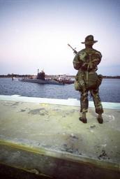| Keywords: outdoor A member of Marine Detachment Security Group 6, part of a Fleet Anti-terrorist Security Team (FAST), watches as the large harbor tugs Tomahawk (YTB-789) and Paducah (YTB-758) guide the nuclear-powered strategic missile submarine USS CASIMIR PULASKI (SSBN-633) to the pier. The FAST and the PULASKI are participating in exercise LantCoopEx 1-89, 5/1/1989 Port Canaveral, Florida Camera Operator: PH1(Sw) J. Alan Elliott National Archives Series: Combined Military Service Digital Photographic Files, 1982 - 2007 Record Group 330: Records of the Office of the Secretary of Defense, 1921 - 2008 A member of Marine Detachment Security Group 6, part of a Fleet Anti-terrorist Security Team (FAST), watches as the large harbor tugs Tomahawk (YTB-789) and Paducah (YTB-758) guide the nuclear-powered strategic missile submarine USS CASIMIR PULASKI (SSBN-633) to the pier. The FAST and the PULASKI are participating in exercise LantCoopEx 1-89, 5/1/1989 Port Canaveral, Florida Camera Operator: PH1(Sw) J. Alan Elliott National Archives Series: Combined Military Service Digital Photographic Files, 1982 - 2007 Record Group 330: Records of the Office of the Secretary of Defense, 1921 - 2008 |