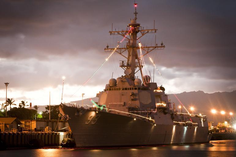 Keywords: uss chung hoon ship military christmas lights decoration navy pier dusk harbor bright reflection water usa winter seasonal decorative
