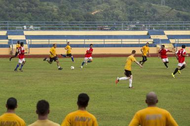 | Keywords: USS Comstock Sailors, 11th MEU Marines play soccer with Royal Malaysian Navy 150127-N-CU914-425.jpg en Sailors and Marines assigned to the dock landing ship USS Comstock LSD 45 and 11th Marine Expeditionary Unit MEU play a game of soccer against the Royal Malaysian Navy during a port visit Comstock part of the Makin Island Amphibious Ready Group is on a deployment with the 11th MEU to promote peace and freedom of the seas by providing security and stability in the U S 7th Fleet area of operations U S Navy photo by Mass Communication Specialist 3rd Class Lenny LaCrosse/Released 2015-01-27 Petty Officer 3rd Class Lenny LaCrosse https //www dvidshub net/image/1742283 150127-N-CU914-425 2015-01-29 20 00 SEPANGGAR MY PD-USGov-Military-Navy \s11th Marine Expeditionary Unit USS Comstock LSD-45 Images from DoD uploaded by Fæ |