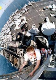 | Keywords: USS Constellation (CV-64) viewed from the main mast.jpg US Navy USN Sailors stationed aboard the KITTY HAWK CLASS Aircraft Carrier USS CONSTELLATION CV 64 go aloft to repair a radar array on the main mast Pictured top-to-bottom are Electronics Technician Third Class ET3 Heath Martin ET3 Charles Robinson and Electronics Technician Second Class ET2 Kevin Carlson http //www dodmedia osd mil/Assets/Still/2004/Navy/DN-SD-04-13152 JPEG ID DN-SD-04-13152 / Service Depicted Navy / 990925-N-2517W-003 Date Shot 25 Sep 1999 Camera Operator PH3 TIMOTHY C WARD USN PD-USGov-Military-Navy Aboard USS Constellation CV-64 Sailors aloft Views from above |