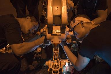 | Keywords: USS Dwight D. Eisenhower Deployment 160901-N-WC455-216.jpg en 160901-N-WC455-216 ARABIAN GULF Sept 1 2016 Aviation Structural Mechanic 2nd Class Marlon Bartolome left from Oak Harbor Wash and Aviation Structural Mechanic 2nd Class Corey Bittner from Mentor Ohio replace a strut on a nose landing strut assembly in the hangar bay of the aircraft carrier USS Dwight D Eisenhower CVN 69 Ike Ike and its Carrier Strike Group are deployed in support of Operation Inherent Resolve maritime security operations and theater security cooperation efforts in the U S 5th Fleet area of operations U S Navy photo by Mass Communication Specialist Seaman Joshua Murray <br>Unit USS Dwight D Eisenhower CVN 69 2016-09-01 Seaman Apprentice Joshua Murray https //www dvidshub net/image/2836724/uss-dwight-d-eisenhower-deployment 160901-N-WC455-216 2016-09-07 00 54 PERSIAN GULF PD-USGov-Military-Navy USS Dwight D Eisenhower CVN-69 Images from DoD uploaded by Fæ |