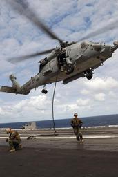 | Keywords: USS Dwight D. Eisenhower flight deck action 120628-N-RY232-372.jpg en U S Navy explosive ordnance disposal personnel repel from an SH-60 Seahawk helicopter onto the flight deck of the aircraft carrier USS Dwight D Eisenhower CVN 69 during a training exercise in the Atlantic Ocean June 28 2012 Dwight D Eisenhower was deployed to the U S 2nd Fleet area of responsibility conducting maritime security operations and theater security cooperation efforts U S Navy photo by Mass Communication Specialist 2nd Class Julia A Casper/Released 2012-06-28 Julia Casper https //www dvidshub net/image/631889 120628-N-RY232-372 2012-07-25 05 43 ATLANTIC OCEAN AT SEA PD-USGov-Military-Navy SH-60 Seahawk United States Navy Explosive Ordnance Disposal USS Dwight D Eisenhower CVN-69 Images from DoD uploaded by Fæ |