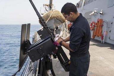 | Keywords: USS Farragut daily operations 150529-N-VC236-004.jpg en 150529-N-VC236-004 ARABIAN GULF - Gunner's Mate Seaman Jorge Rangel from Bingen Wash performs scheduled maintenance on a 50-caliber machine gun aboard the guided-missile destroyer USS Farragut Farragut is deployed to the U S 5th Fleet area of operations as part of Theodore Roosevelt Carrier Strike Group supporting Operation Inherent Resolve strike operations in Iraq and Syria as directed maritime security operations and theater security cooperation efforts in the region 2015-05-29 May 29 2015 https //www dvidshub net/image/1969264 150529-N-VC236-004 2015-06-02 09 09 ARABIAN GULF USS FARRAGUT AT SEA 3 PD-USGov-Military-Navy USS Farragut DDG-99 Images from DoD uploaded by Fæ |