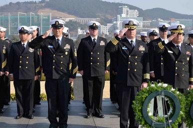 | Keywords: USS Frank Cable action 150316-N-EV320-032.jpg en BUSAN Republic of Korea - Command Master Chief Paul Sweeney left assigned to the submarine tender USS Frank Cable Capt Mark Benjamin center commanding officer of Frank Cable and Cmdr Hee-Chan Lee of the republic of Korea Navy render salutes as taps is played at a memorial ceremony dedicated to those who lost their lives in the Korean War at the United Nations Memorial Cemetery Korea in Busan Republic of Korea March 16 The memorial cemetery contains 2 300 graves of the United Nations Command service members who died in the Korean War Frank Cable is in Busan for a port visit that has included various community service events and military to military engagements designed to strengthen partnership with the Republic of Korea navy Frank Cable forward deployed to the island of Guam conducts maintenance and support of submarines and surface vessels deployed to the U S 7th Fleet area of responsibility and is currently on a scheduled underway period 2015-03-16 March 16 2015 https //www dvidshub net/image/1824960 150316-N-EV320-032 2015-03-20 00 02 26 KR PD-USGov-Military-Navy USS Frank Cable AS-40 Images from DoD uploaded by Fæ United Nations Memorial Cemetery |