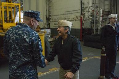 | Keywords: USS George Washington 141203-N-GT589-015.jpg en Vice Adm Nanette M DeRenzi Judge Advocate General of the Navy center greets Rear Adm John Alexander commander of Battle Force U S 7th Fleet in the hangar bay of the Nimitz-class aircraft carrier USS George Washington during a visit to the ship George Washington and its embarked air wing Carrier Air Wing 5 provide a combat-ready force that protects and defends the collective maritime interests of the U S and its allies and partners in the Indo-Asia-Pacific region 2014-12-03 CVN 73 https //www dvidshub net/image/1685792 141203-N-GT589-015 2014-12-03 16 52 USS GEORGE WASHINGTON CVN 73 AT SEA PD-USGov-Military-Navy USS George Washington CVN-73 Images from DoD uploaded by Fæ John D Alexander Nanette M DeRenzi |