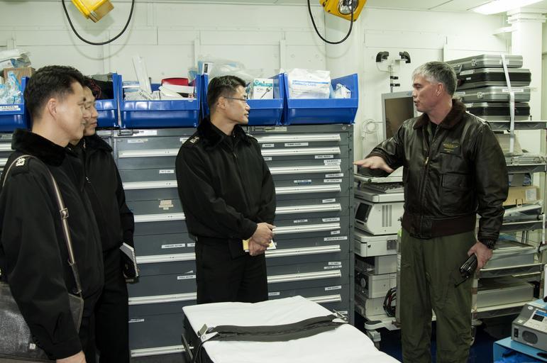 Keywords: USS George Washington tour 141210-N-XF988-086.jpg en Cmdr Rodney Hagerman senior medical officer for the Nimitz-class aircraft carrier USS George Washington speaks with members of the Republic of Korea navy in the treatment room during a tour of the ship's medical department George Washington and its embarked air wing Carrier Air Wing 5 provide a combat-ready force that protects and defends the collective maritime interest of the U S and its allies and partners in the Indo-Asia-Pacific region 2014-12-10 CVN 73 https //www dvidshub net/image/1697380 141210-N-XF988-086 2014-12-11 18 36 YOKOSUKA JP PD-USGov-Military-Navy USS George Washington CVN-73 Images from DoD uploaded by Fæ |