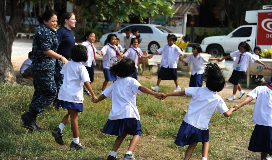 Keywords: USS Germantown builds relationship with Thai School 120223-N-LP801-085.jpg en Engineman 3rd Class Ia Vang left and Engineman 3rd Class Victoria Moore assigned to the forward-deployed amphibious dock landing ship USS Germantown hold hands with Thai children while participating in a community service project during a port visit to the Kingdom of Thailand Germantown with embarked elements of the 31st Marine Expeditionary Unit is currently underway after participating in exercise Cobra Gold 2012 an annual Thai-U S co-sponsored joint and multinational exercise designed to advance security throughout the Asia-Pacific region and enhance interoperability with participating nations U S Navy photo by Mass Communication Specialist Seaman Raul Moreno Jr 2012-02-23 Seaman Raul Moreno Jr https //www dvidshub net/image/531242 120223-N-LP801-085 2012-02-25 08 05 TH PD-USGov-Military-Navy 31st Marine Expeditionary Unit Images from DoD uploaded by Fæ |