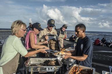 | Keywords: USS Halsey steel beach barbecue 141106-N-IC565-131.jpg en Cooks from the Valley members prepare and serve steaks to Sailors aboard the Arleigh Burke-class guided-missile destroyer USS Halsey DDG 97 during a steel beach barbecue Cooks from the Valley is a diverse group of businessmen and women who since 2001 have delivered approximately 53 tons of Harris Ranch 12 ounce New York steaks to more than 140 000 Sailors and Marines around the world Halsey is on deployment in the U S 7th Fleet area of operations supporting security and stability in the Indo-Asia-Pacific region U S Navy photo by Mass Communication Specialists 3rd Class Bradley J Gee/Released 2014-11-06 Petty Officer 3rd Class Bradley Gee https //www dvidshub net/image/1647117 141106-N-IC565-131 2014-11-06 19 47 USS HALSEY DDG 97 AT SEA PD-USGov-Military-Navy USS Halsey DDG-97 Images from DoD uploaded by Fæ |