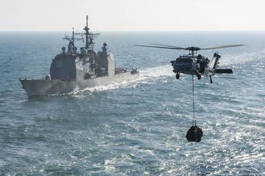 | Keywords: USS Harry S. Truman replenishment 140115-N-ZG705-276.jpg en An MH-60S Seahawk helicopter assigned to the Dusty Dogs of Helicopter Sea Combat Squadron 7 transports cargo from the aircraft carrier USS Harry S Truman to the Military Sealift Command fast combat support ship USNS Arctic while the guided-missile cruiser USS Gettysburg transits behind during a replenishment at sea Harry S Truman flagship for the Harry S Truman Carrier Strike Group is deployed to the U S 5th Fleet area of responsibility conducting maritime security operations supporting theater security cooperation efforts and supporting Operation Enduring Freedom 2014-01-15 HSC https //www dvidshub net/image/1151984 140115-N-ZG705-276 2014-01-17 16 26 USS HARRY S TRUMAN AT SEA PD-USGov-Military-Navy MH-60S Seahawk Operation Enduring Freedom USS Harry S Truman CVN-75 Images from DoD uploaded by Fæ |
