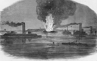 | Keywords: USS Indianola blown up.jpg USS Indianola an American Civil War river gunboat blown up by confederates to avoid recapture after a dummy Union warship appears Original caption Line engraving after a sketch by Theodore R Davis published in Harper's Weekly 1863 depicting the 25 February 1863 operation in which a dummy ironclad left was floated down the Mississippi River by the U S Navy causing the Confederates to destroy the captured ironclad USS Indianola CSS Queen of the West is depicted at the right <br> Ship was sunk at the head of Palmyra island Then adjacent to the plantation of Jefferson Davis and New Carthage Shown on this map http //www geographicus com/P/AntiqueMap/MissRive2Col-USCS-1864 Current day view of present day Davis Island is shown http //members cox net/wplong1/images/Copy 20 2 20of 20USGS_C253BB0924BCAC30_1 jpg here Published in Harper's Weekly in 1863 http //www history navy mil/photos/sh-usn/usnsh-i/indanola htm 1863 Harper's Weekly line engraving after a sketch by Theodore R Davis 32 211944 -91 127102 PD-old PD-USGov Time and place is 25 February 1863 Louisiana Palmyra creek 1863 in Louisiana River gunboats of the American Civil War USS Queen of the West ship 1854 Louisiana in the American Civil War Explosions in art USS Indianola |