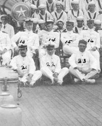 | Keywords: USS Iowa crew H97949.jpg Removed caption read Photo NH 97949 Gunner Mons Monssen 22 and other officers on USS Iowa 1906 Gunner Mons Monssen USN seated 22 On board USS Iowa Battleship 4 1906 Cropped from http //www history navy mil/photos/images/h97000/h97948 jpg Photo NH 97948 Others present include as numbered and identified on the original print 13 Surgeon Moulton K Johnson; 14 Lieutenant Duncan M Wood; 15 Lieutenant George K Pettengill; 16 Ensign David A Weaver; 21 unidentified Warrant Officer; 23 Boatswain John P Judge Courtesy of the Naval Historical Foundation Washington D C U S Naval Historical Center Photograph http //www history navy mil/photos/pers-us/uspers-m/m-monsen htm PD_USN USS Iowa BB-4 Sailors from the United States Navy Iowa |