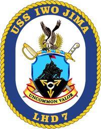 | Keywords: USS Iwo Jima COA.png en Emblem of the USS Iwo Jima LHD-7 2011-06-08 United States Army Institute of Heraldry Member of the Armed Forces of the United States PD-USGov Seal The coat of arms emblazoned upon a white oval enclosed by a blue collar edged on the outside with gold rope and inscribed USS IWO JIMA above and LHD 7 below in gold Shield Iwo Jima was the site of one of the most important and bitterly fought amphibious operations of World War II The United States Marine Corps War Memorial is based on the Immortal photograph of the flag raising on Mount Suribachi on February 23rd 1945 and has become a symbol of strength courage and valor The three spearheads represent the amphibious triad The Landing Craft Air Cushion LCAC The Amphibious Assault Vehicle AAV and the V-22 Osprey Tilt Rotor Aircraft The light blue reflects the seas of the world The USS IWO JIMA LHD 7 one of the last ships propelled by steam boilers is reflected by the white disc with the Hero's boiler Crest The USS IWO JIMA LHD 7 is configured to deploy with the V-22 Osprey Tilt Rotor Aircraft This is symbolized by the attacking Osprey The previous USS IWO JIMA LPH 2 was a helo-carrier during the Vietnam Era The palm fronds commemorate the previous ship and its service in Vietnam Motto The motto is based on Fleet Admiral Chester W Nimitz's words when he spoke of the Sailors and Marines who fought at the battle of Iwo Jima Among the Americans who fought at Iwo Jima uncommon valor was a common virtue The red is emblematic of valor and sacrifice Supporters The crossed swords highlight cooperation and unity that typify the U S Navy and Marine Corps Blue-Green Team Uploaded with UploadWizard United States Navy landing ships emblems LHD-7 Aboard USS Iwo Jima LHD-7 Amphibious assault ships of the United States |