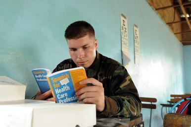 | Keywords: USS Kearsarge-Continuing Promise 2008 DVIDS109321.jpg en Michael Hagglund hospital corpsman assigned to the amphibious assault ship USS Kearsarge medical department reads an English to Spanish health care dialect book before Nicaraguan civilians arrive for eye exams at Jose Comenius High School Kearsarge is deployed as the primary platform supporting the Caribbean phase of Continuing Promise 2008 an equal-partnership mission between the United States Canada the Netherlands Brazil Nicaragua Panama Colombia Dominican Republic Trinidad and Tobago and Guyana 2008-08-13 Petty Officer 2nd Class William Parker https //www dvidshub net/image/109321 080813-N-+++++-138 2008-08-18 13 45 PUERTO CABEZAS NI PD-USGov-Military-Navy USS Kearsarge LHD-3 Images from DoD uploaded by Fæ |