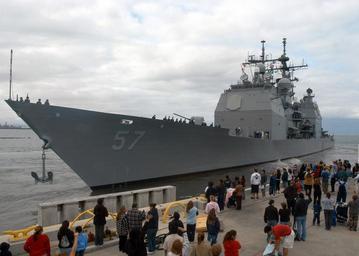 | Keywords: USS Lake Champlain (CG-57) prepares to get underway.jpg Family members and friends wave good-bye from the pier as the US Navy USN TICONDEROGA CLASS Guided Missile Cruiser Aegis USS LAKE CHAMPLAIN CG 57 weighs anchor to get underway from her homeport at Naval Air Station NAS North Island California CA CG 57 and her crew are deploying to the Eastern and Western Pacific Region to conduct joint and combined operations during a regularly scheduled deployment Location NAVAL AIR STATION NORTH ISLAND CALIFORNIA CA UNITED STATES OF AMERICA USA http //www dodmedia osd mil/Assets/Still/2004/Navy/DN-SD-04-15088 JPEG ID DN-SD-04-15088 / Service Depicted Navy / 040524-N-7615S-043 Date Shot 24 May 2004 Camera Operator PHAN DANIELLE M SOSA USN USS Lake Champlain CG-57 PD-USGov-Military-Navy |