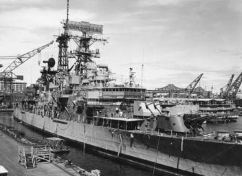 | Keywords: USS Little Rock (CLG-4) at Boston Naval Shipyard 1971.jpg The U S Navy guided missile cruiser USS Little Rock CLG-4 undergoing an inclining experiment at the Boston Naval Shipyard Massachusetts USA 28 March 1971 Note her radars front to back Mk 34 gun director with Mk 13 radar; Mk 37 gun director with Mk 25 radar; SPS-37A and SPS-10 radar on the foremast and TACAN URN-3 on the mainmast; SPS-30 search radar atop the after superstructure Official U S Navy photograph http //www history navy mil/photos/images/h98000/h98982c htm NH 98982 1971-03-28 USN PD-USGov-Military-Navy 1971 in Boston USS Little Rock CLG-4 Ship radars of the United States Navy Boston Navy Yard AN/SPS-30 AN/SPS-43 |