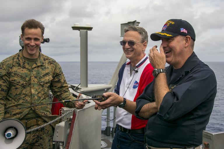 Keywords: USS Makin Island places call to the International Space Station 150219-N-KL846-013.jpg en 150219-N-KL846-013 PACIFIC OCEAN Feb 19 2015 - Capt Jon Rodgers commanding officer of the amphibious assault ship USS Makin Island LHD 8 laughs with NASA aerospace engineer Carl Martin as they prepare to use an amateur HAM radio to speak to Capt Barry Butch Wilmore the current commander of the International Space Station The broadcast was made possible by Martin the father of Marine Cpl Daniel Martin who is riding the ship during its tiger cruise out of Hawaii Makin Island the flagship of the Makin Island Amphibious Ready Group is returning to home port San Diego following a seven-month deployment to the Western Pacific and U S Central Command areas of operation U S Navy photo by Mass Communication Specialist 2nd Class Christopher Lindahl/Released 2015-02-19 Petty Officer 2nd Class Christopher Lindahl https //www dvidshub net/image/1780819 150219-N-KL846-013 2015-02-21 18 36 USS MAKIN ISLAND PACIFIC OCEAN AT SEA PD-USGov-Military-Navy USS Makin Island LHD-8 Images from DoD uploaded by Fæ |