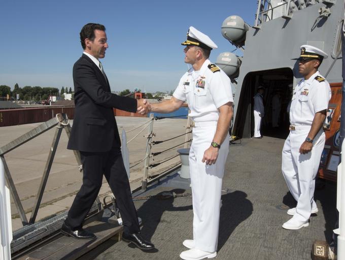 Keywords: USS Mason action 130805-N-PW661-001.jpg en From left Adam H Sterling the Charge d'Affaires at the U S Embassy in Amsterdam shakes hands with U S Navy Cmdr Wilson Marks the commanding officer of the guided missile destroyer USS Mason DDG 87 as Lt Cmdr Mikal Phillips the ship's executive officer stands by Aug 5 2013 in Amsterdam The Mason was on a port visit to the city while deployed as part of the Harry S Truman Carrier Strike Group in support of maritime security operations and theater security cooperation efforts in the U S 6th Fleet area of responsibility U S Navy photo by Mass Communication Specialist 2nd Class Rob Aylward/Released 2013-08-05 Petty Officer 3rd Class Rob Aylward https //www dvidshub net/image/1019912 130805-N-PW661-001 2013-09-17 05 45 AMSTERDAM NL PD-USGov-Military-Navy USS Mason DDG-87 Images from DoD uploaded by Fæ |