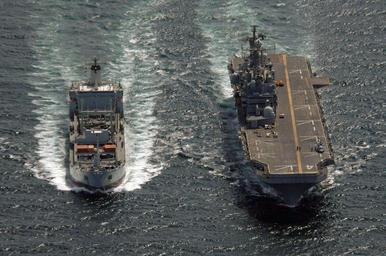 | Keywords: USS Nassau (LHA-4) and RFA Bayleaf (A109).jpg US Navy photo 060219-N-4374S-011 Persian Gulf Feb 19 2006 - The British Royal Fleet Auxiliary ship RFA Bayleaf A 109 approaches the amphibious assault ship USS Nassau LHA 4 for a replenishment at sea RAS Nassau is currently on a regularly scheduled deployment conducting maritime security operations MSO MSO sets the conditions for security and stability in the maritime environment as well as complement the counter-terrorism and security efforts of regional nations MSO also deny international terrorists use of the maritime environment as a venue for attack or to transport personnel weapons or other material U S Navy photo by Photographer's Mate 2nd Class Michael J Sandberg RELEASED PD-USGov-Military-Navy International groups of naval ships RFA Bayleaf A109 Underway replenishment General views of USS Nassau LHA-4 |