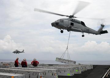 | Keywords: USS Nimitz takes on supplies DVIDS319410.jpg en An SH-60F Sea Hawk helicopter assigned to the Indians of Helicopter Anti-Submarine Squadron 6 airlifts ordnance from the flight deck of the aircraft carrier USS Nimitz during an ammunition offload Nimitz is conducting blue water operations in the U S 3rd Fleet area of responsibility 2010-09-14 U S Navy photo by Seaman Thomas Siniff https //www dvidshub net/image/319410 100914-N-+++++-153 2010-09-16 17 02 USS NIMITZ AT SEA PD-USGov-Military-Navy USS Nimitz CVN-68 Images from DoD uploaded by Fæ |