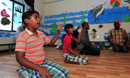 | Keywords: USS Pearl Harbor DVIDS317538.jpg en Petty Officer 3rd Class Stephen Williams damage controlman center and Petty Officer 3rd Class Ralph Oliver religious programs specialist right perform breathing exercises during a yoga session with children at the RIA Institute in Manama Bahrain Sailors from the amphibious dock landing ship USS Pearl Harbor LSD 52 participated in a community relations project at the RIA Institute playing various games trying yoga and swimming Pearl Harbor is part of Peleliu Amphibious Ready Group supporting maritime security operations and theater security cooperation efforts in the U S 5th Fleet area of responsibility 2010-09-12 Petty Officer 2nd Class Michael Russell https //www dvidshub net/image/317538 100912-N-+++++-001 2010-09-12 02 46 BH PD-USGov-Military-Navy USS Pearl Harbor LSD-52 Manama Images from DoD uploaded by Fæ |