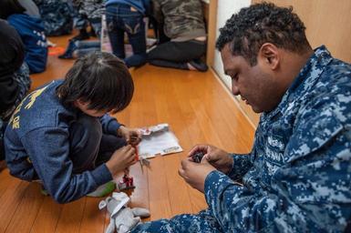 | Keywords: USS Ronald Reagan activity 151222-N-OI810-251.jpg en 151222-N-OI810-251 YOKOSUKA Japan Dec 22 2015 Fire Controlman 1st Class Frank Ware from Jacksonville N C and a child from Shunko Gakuen Children's Home play with a Christmas gift from Sailors of the U S Navy's only forward-deployed aircraft carrier USS Ronald Reagan CVN 76 during a community relations project Ronald Reagan provides a combat-ready force that protects and defends the collective maritime interests of the U S and its allies and partners in the Indo-Asia-Pacific region U S Navy photo by Mass Communication Specialist 3rd Class Nathan Burke/Released <br>Unit USS RONALD REAGAN CVN 76 2015-12-22 Nathan C Burke https //www dvidshub net/image/2341602/uss-ronald-reagan-activity 151222-N-OI810-251 2015-12-22 06 34 USS RONALD REAGAN CVN 76 AICHI JP PD-USGov-Military-Navy USS Ronald Reagan CVN-76 Images from DoD uploaded by Fæ |