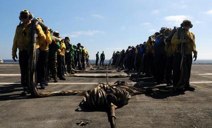 | Keywords: USS Ronald Reagan DVIDS319774.jpg en Sailors carry an aircraft crash barricade during an emergency aircraft recovery drill aboard the aircraft carrier USS Ronald Reagan The barricade is a last resort measure to safely land an aircraft that is unable to use its tail hook Ronald Reagan is underway in the Pacific Ocean conducting drills in preparation for its upcoming deployment 2010-09-14 U S Navy photo by Petty Officer 3rd Class Kevin Gray https //www dvidshub net/image/319774 100914-N-+++++-102 2010-09-17 07 55 PACIFIC OCEAN AT SEA PD-USGov-Military-Navy USS Ronald Reagan CVN-76 Images from DoD uploaded by Fæ |