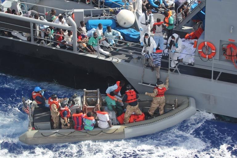 | Keywords: USS San Antonio assists in rescue 131017-N-ZZ999-007.jpg en Distressed persons are transferred from the amphibious transport dock ship USS San Antonio to armed forces of Malta offshore patrol vessel P52 San Antonio provided food water medical attention and temporary shelter to the rescued San Antonio rescued 128 men adrift in an inflatable raft after responding to a call by the Maltese government 2013-10-17 LPD 17 https //www dvidshub net/image/1036388 131017-N-ZZ999-007 2013-10-17 18 49 USS SAN ANTONIO AT SEA PD-USGov-Military-Navy USS San Antonio LPD-17 Images from DoD uploaded by Fæ |