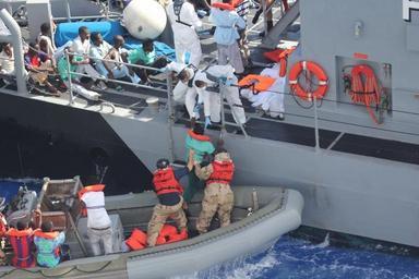 | Keywords: USS San Antonio assists in rescue 131017-N-ZZ999-008.jpg en Distressed persons are transferred from the amphibious transport dock ship USS San Antonio to armed forces of Malta offshore patrol vessel P52 San Antonio provided food water medical attention and temporary shelter to the rescued San Antonio rescued 128 men adrift in an inflatable raft after responding to a call by the Maltese government 2013-10-17 LPD 17 https //www dvidshub net/image/1036389 131017-N-ZZ999-008 2013-10-17 18 49 USS SAN ANTONIO AT SEA PD-USGov-Military-Navy USS San Antonio LPD-17 Images from DoD uploaded by Fæ |